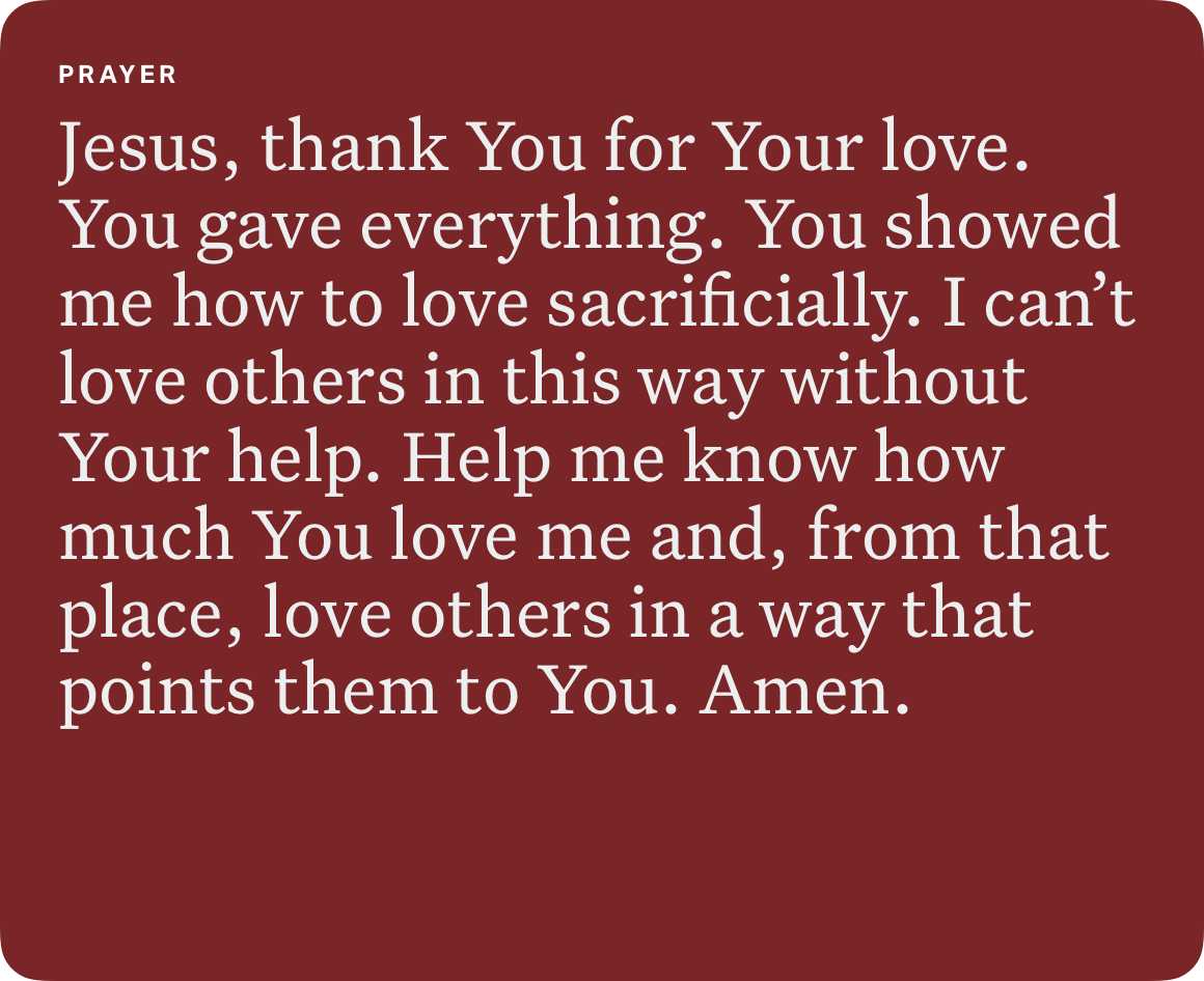 This kind of love is challenging. It asks us to look beyond our own needs and to see the needs of others. It calls us to be selfless. The good news is, Jesus isn’t asking us to do anything for someone else that He wasn’t willing to do for us first. He knows ...
