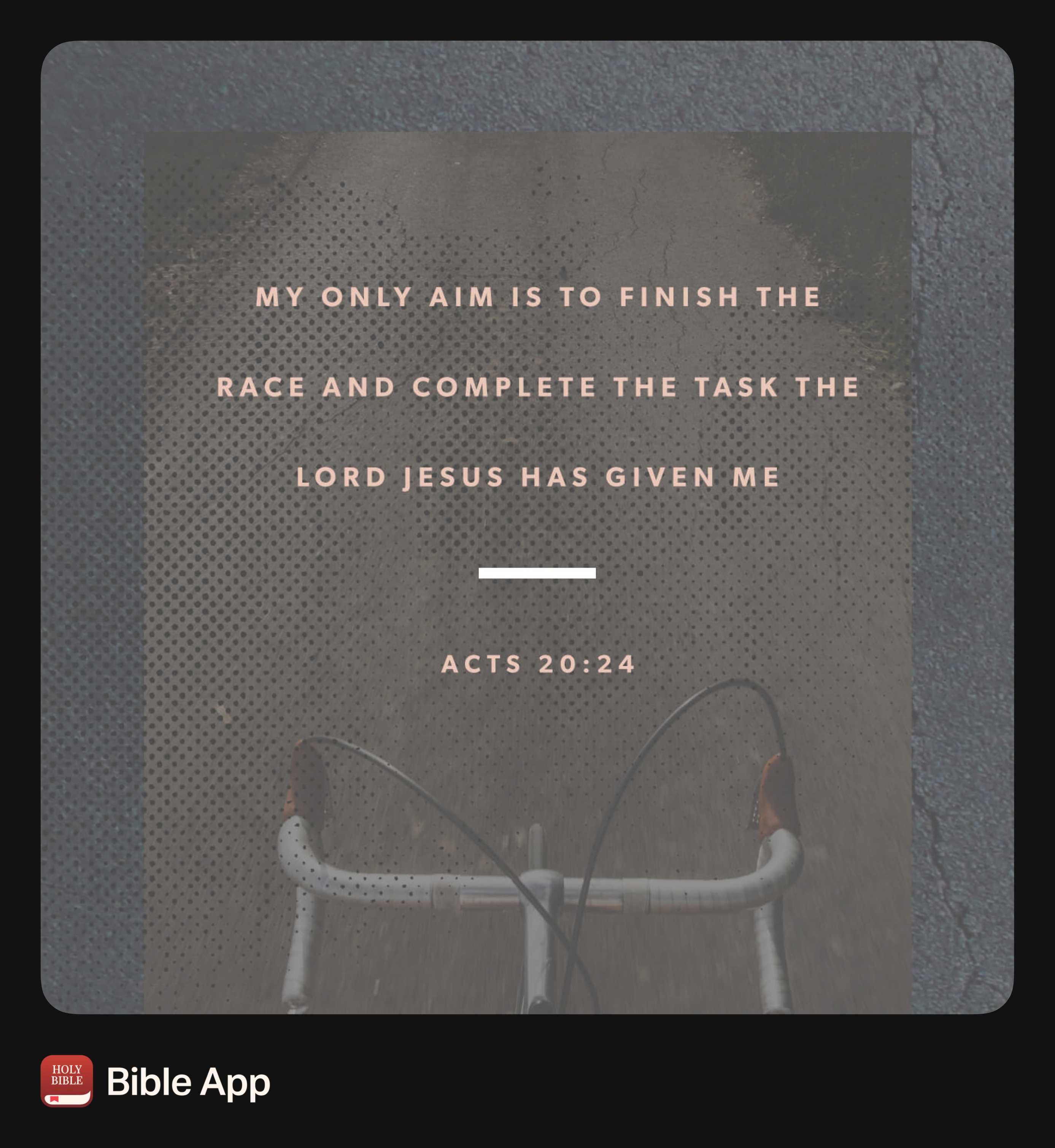 "However, I consider my life worth nothing to me; my only aim is to finish the race and complete the task the Lord Jesus has given me—the task of testifying to the good news of God's grace."