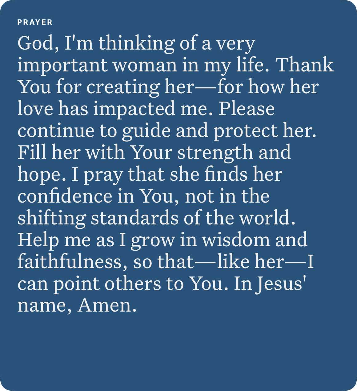 So if you know a woman like that—one who loves and respects God, one who honors and cares for people, one who invests wisely and lives purposefully—you might take a moment to thank God for her life. You might even consider how you can be more like her … as she aims to be more like Him.