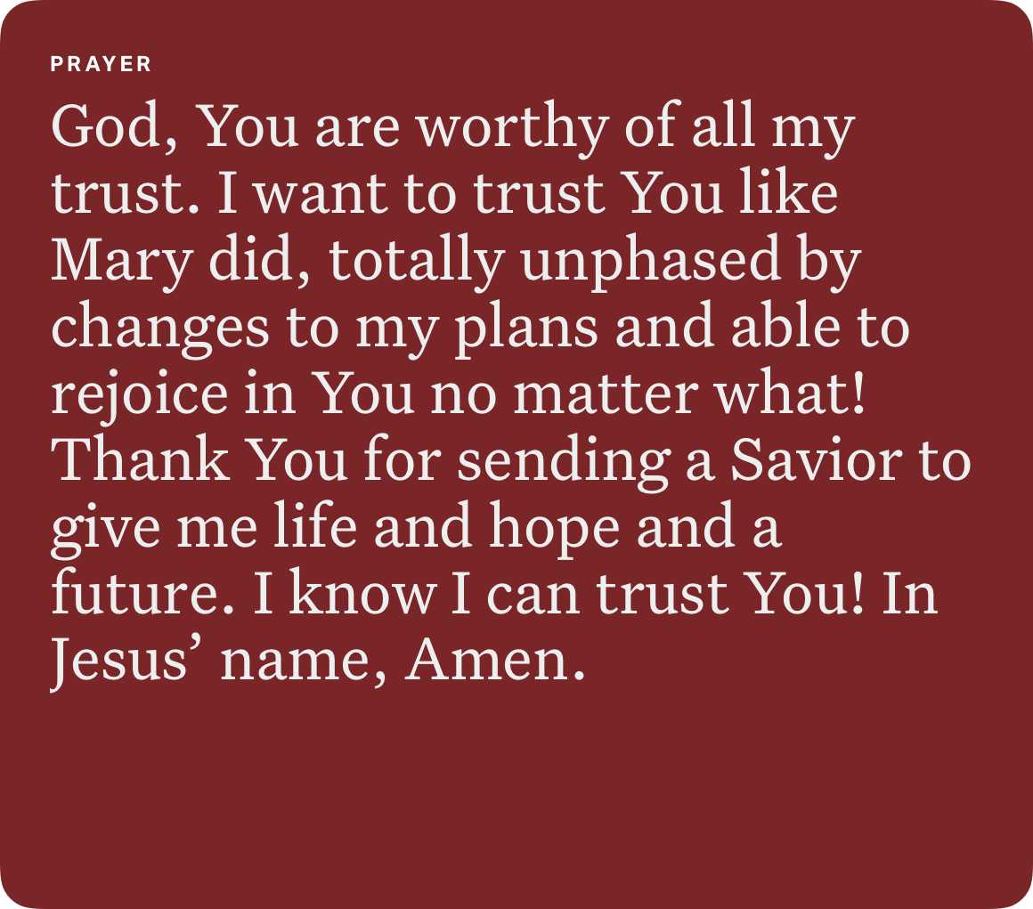Keep in mind, Mary had only just found out about her pregnancy. It would have been so easy, so understandable to be overwhelmed, afraid, or distressed. Mary had not even yet wed her husband, Joseph. And yet, watch the trust and ...