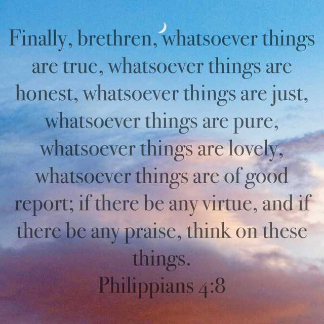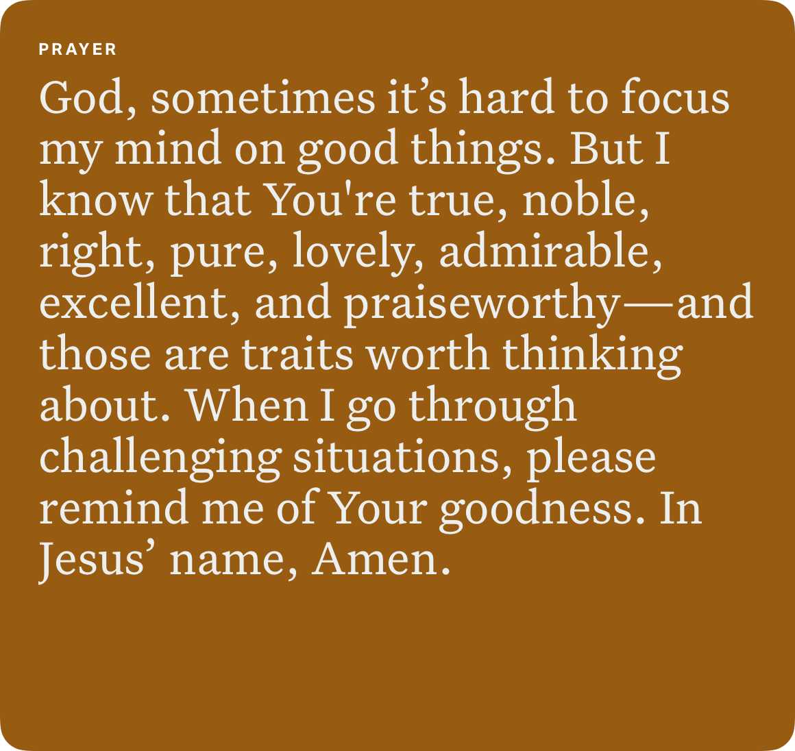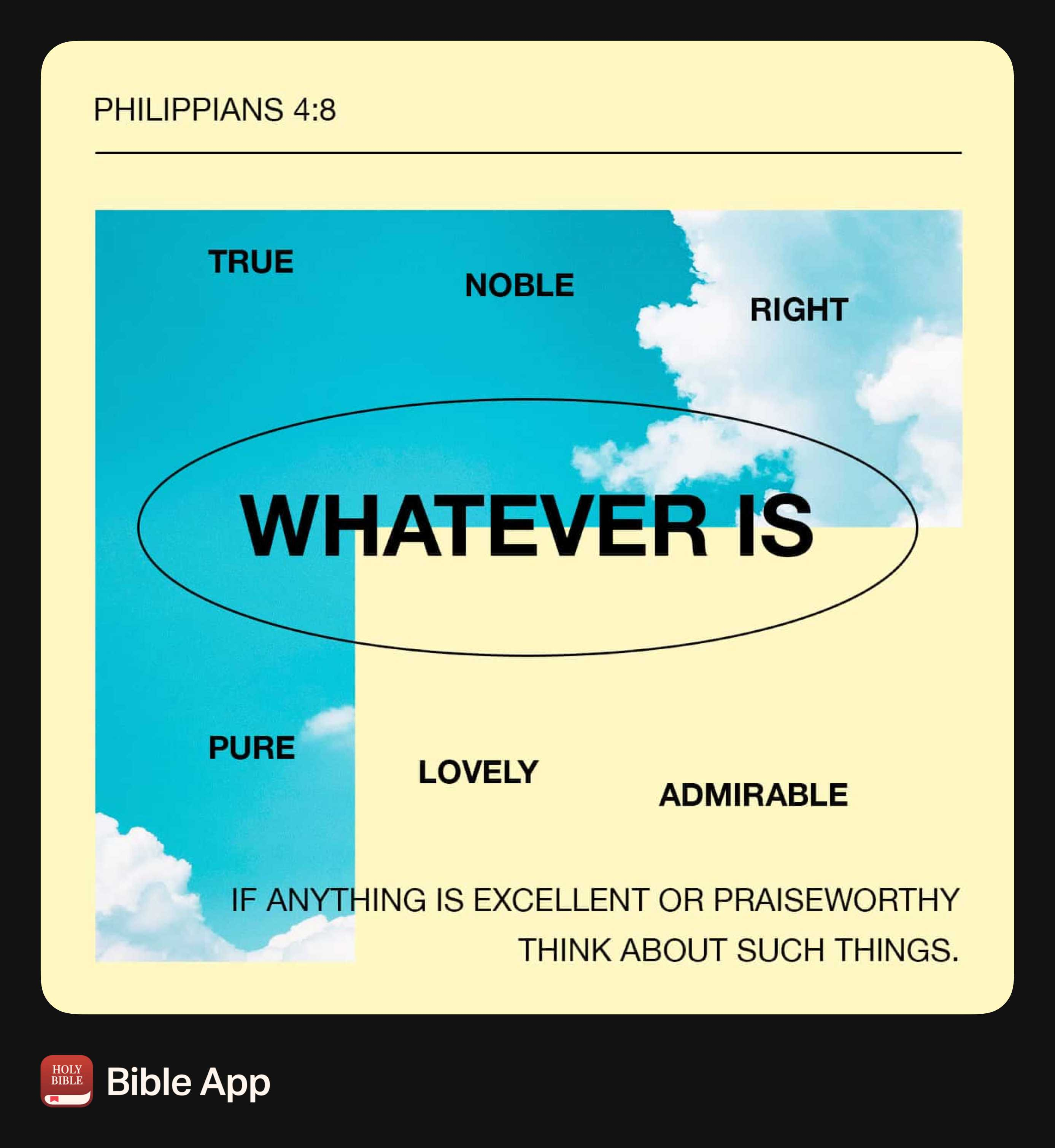 “Finally, brothers and sisters, whatever is true, whatever is noble, whatever is right, whatever is pure, whatever is lovely, whatever is admirable—if anything is excellent or praiseworthy—think about such things.”