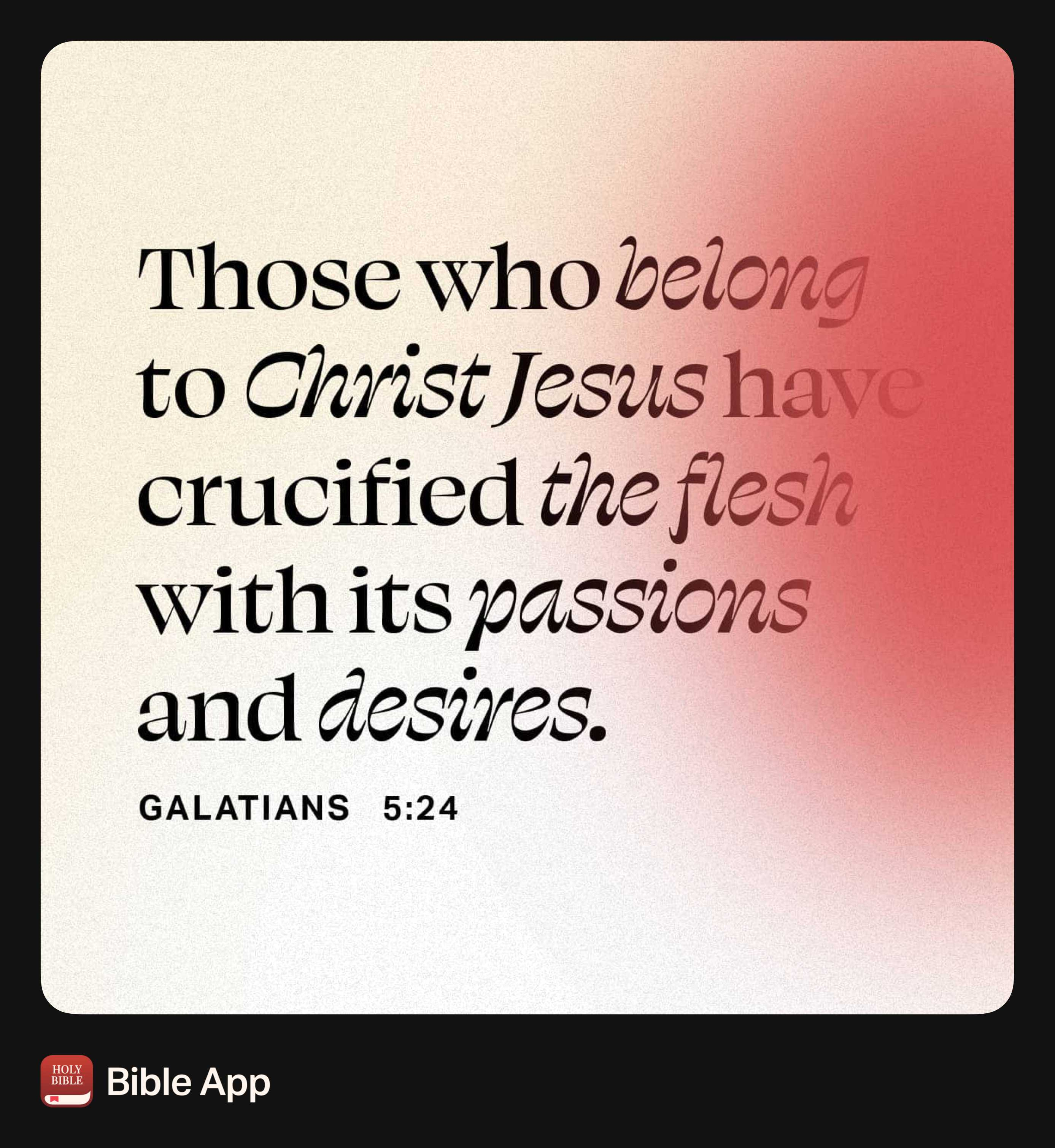 “The flesh” refers to our unchecked desires that pull us away from God’s Spirit. Those desires produce hate, impatience, bitterness, selfishness, chaos, anxiety, and self-indulgence—and God has no association with such things.