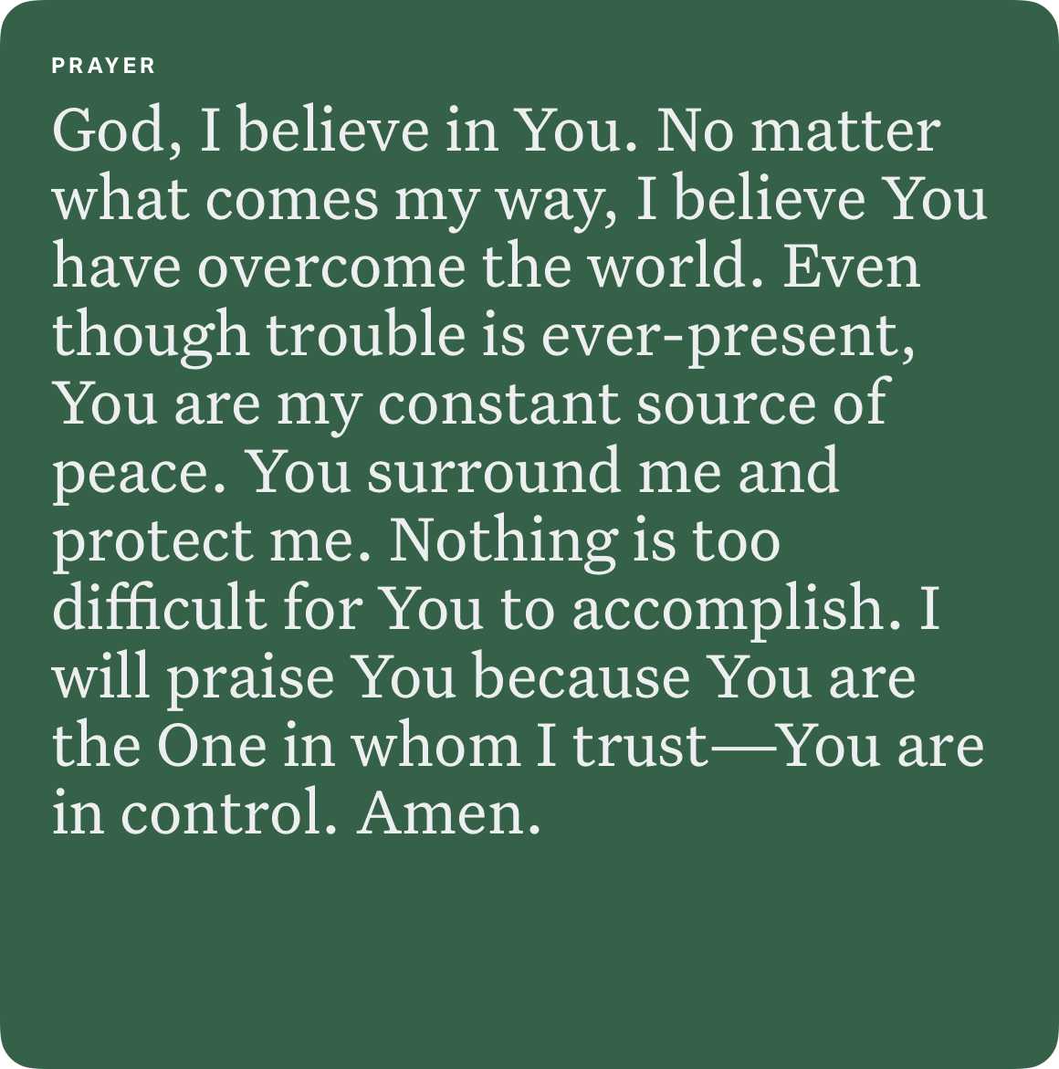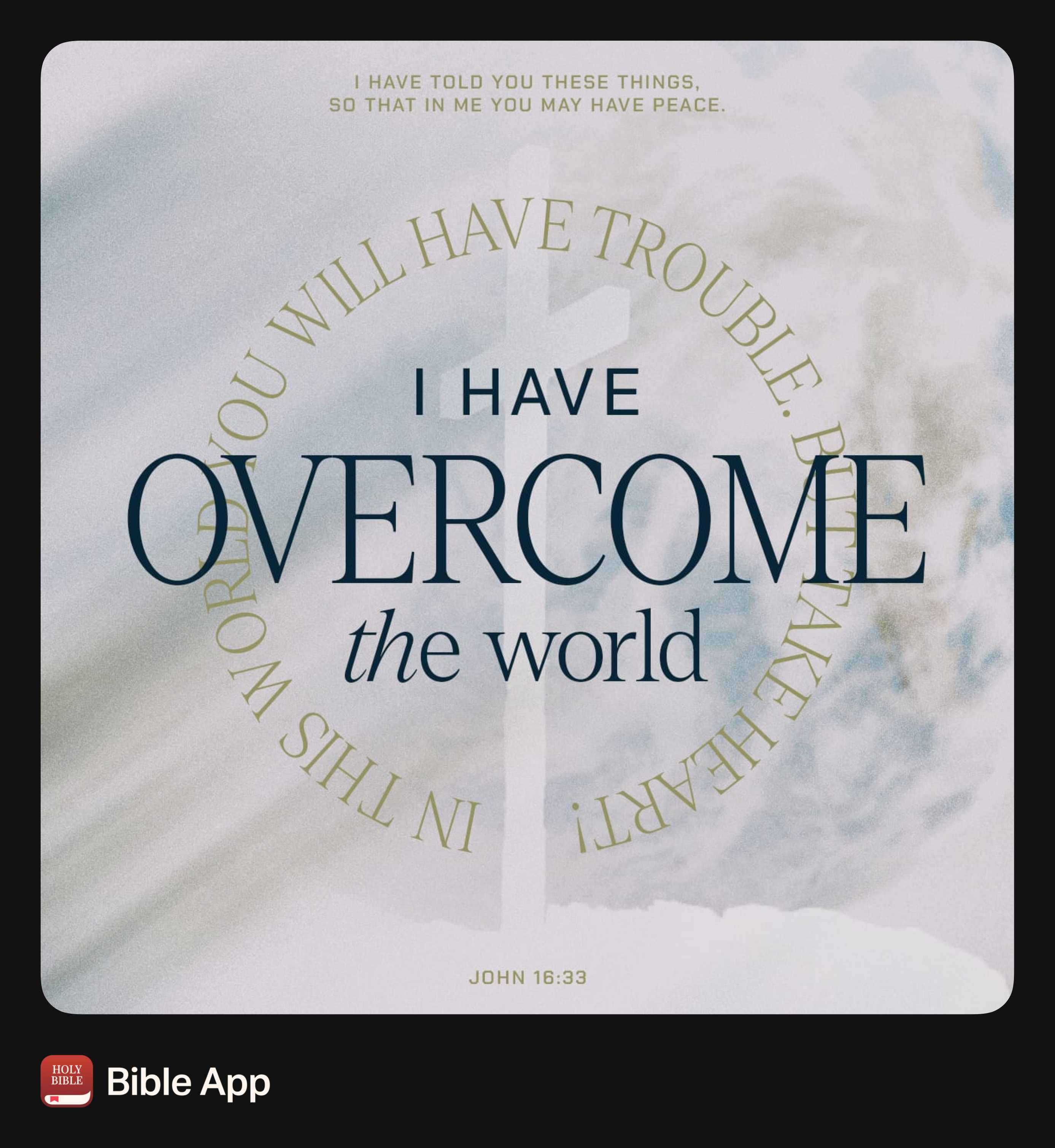 “I have told you these things, so that in me you may have peace. In this world you will have trouble. But take heart! I have overcome the world.”