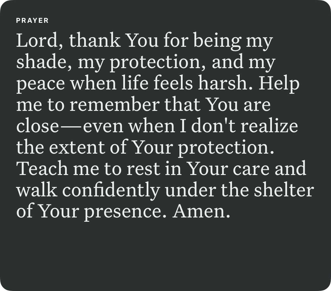 His protection is personal and present. He’s not watching over you from a distance; He’s close by—actively guarding you from the elements that would otherwise wear you down, drain you, make you delirious, burn you, or even kill you.