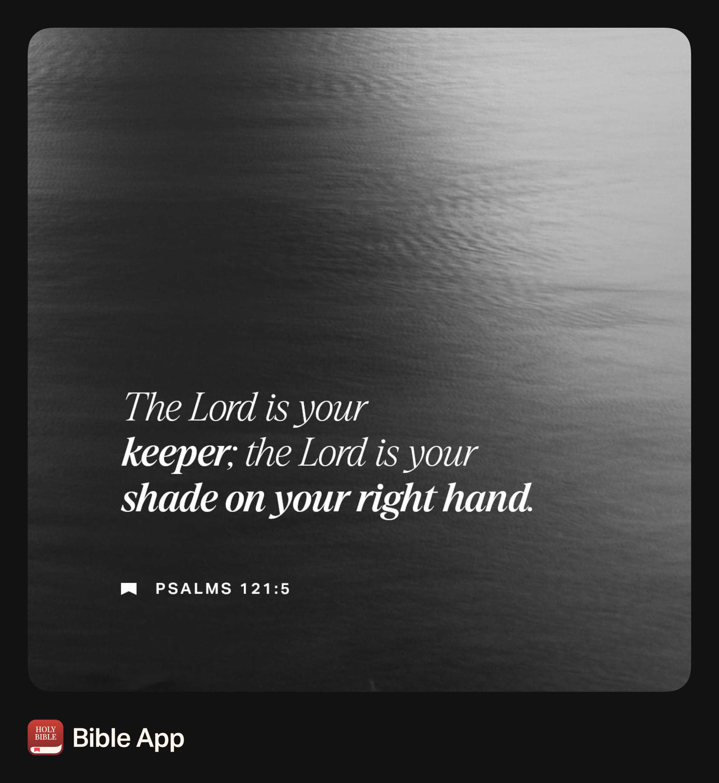 In verse 5, the psalmist writes: “The Lord is your shade at your right hand.” For a weary traveler in the Middle East, shade was life-saving. The sun wasn’t just uncomfortable, it could be dangerous. So, shade meant relief, protection, even survival. That’s the kind of watchful care God offers. The Lord is right beside you: “at your right hand.”