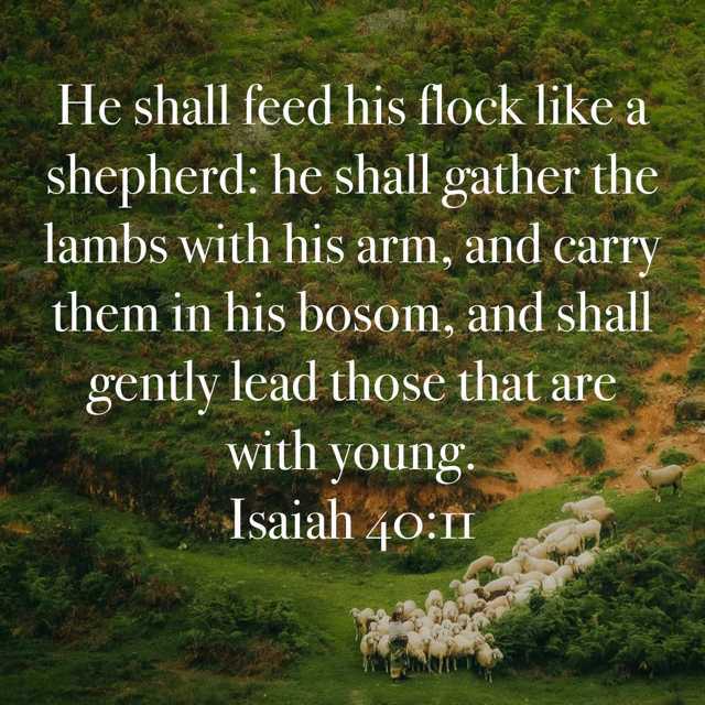 In this verse, Isaiah compares our God to a shepherd who cares daily for a flock of sheep. We, like sheep, have a tendency to wander and go astray. Sheep fall into traps or are killed and eaten by predators. But a shepherd's only priority is the care and safety of his flock. A shepherd must be strong enough to carry a wounded ewe or to ward off wolves from a stranded lamb, but caring enough to nurture them and lead them to green pastures.